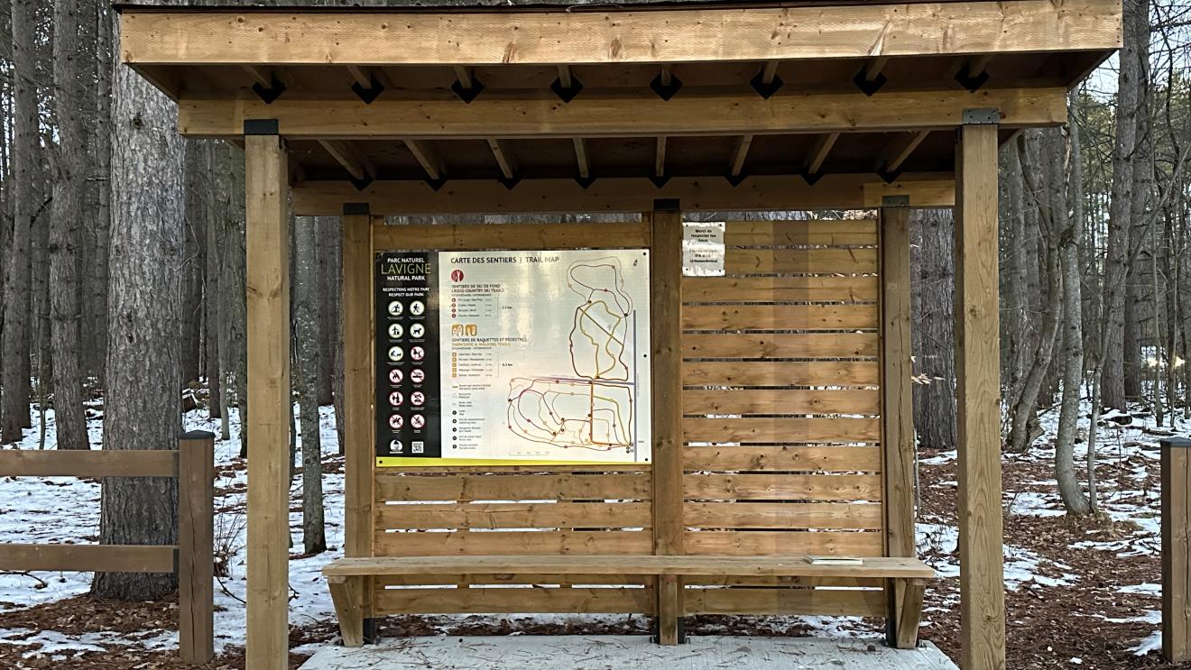 La carte des sentiers [PDF/1.1MB] est affichée aux entrées et à certains endroits stratégiques dans le parc.